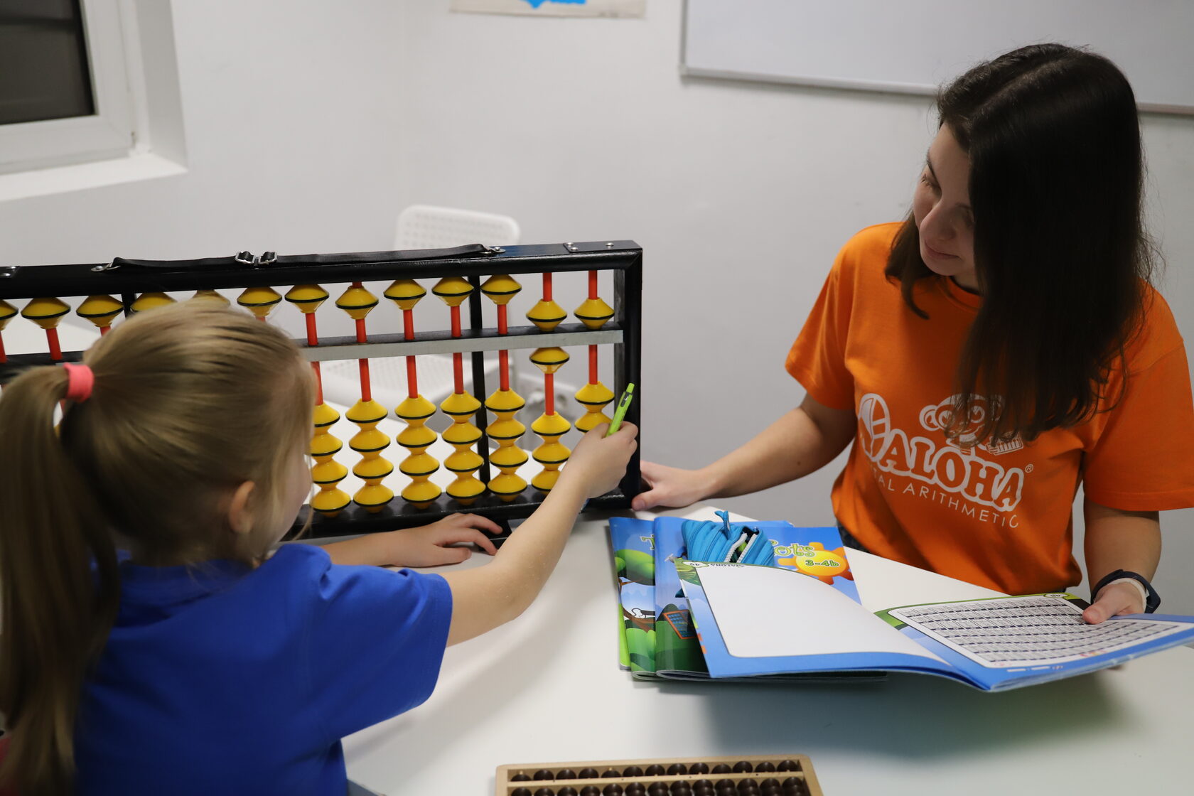 Во-вторых, обучение проходит без использования гаджетов. Всё происходит «вживую»: ручка, карандаш, бумага и физический абакус. Это помогает развивать мелкую моторику, удерживать внимание и не отвлекаться на экраны.